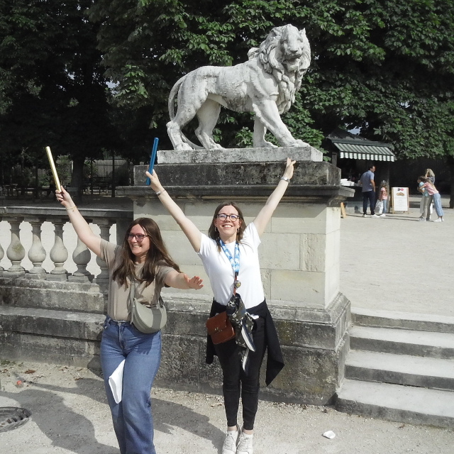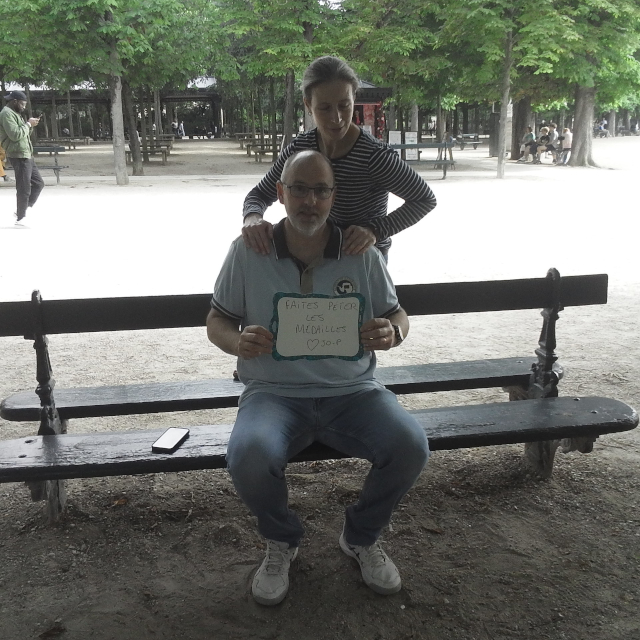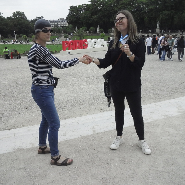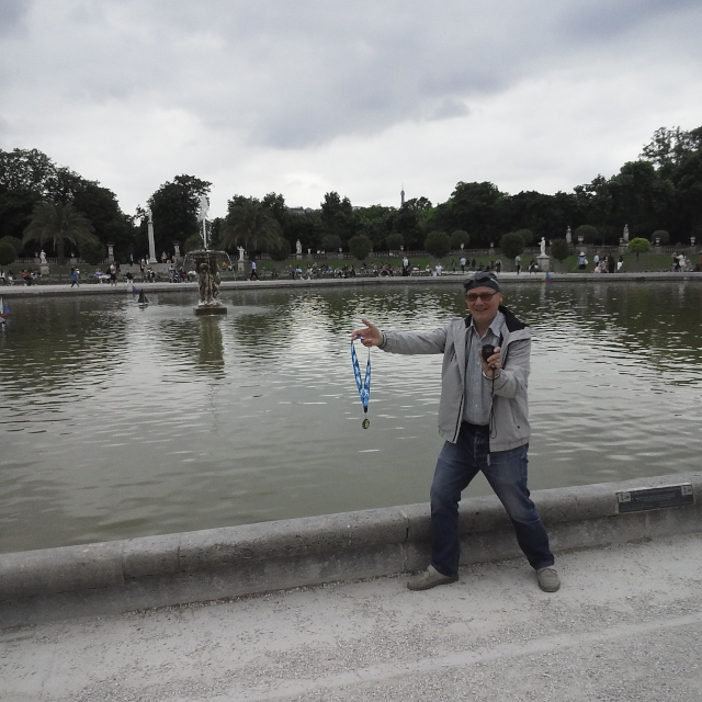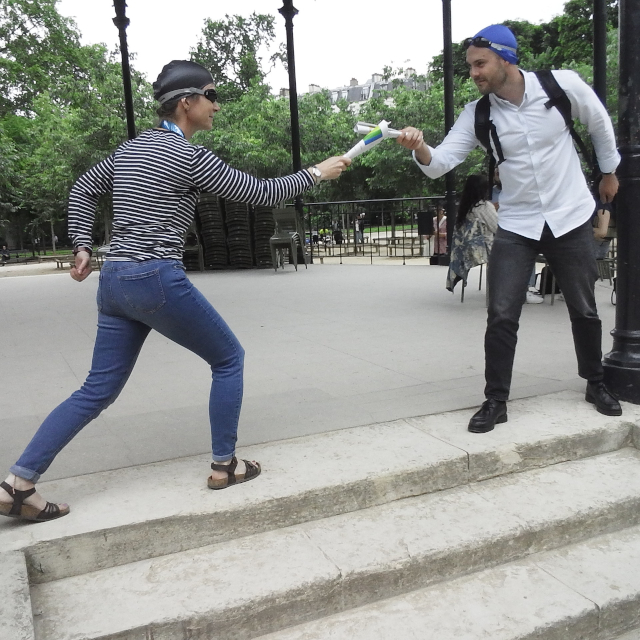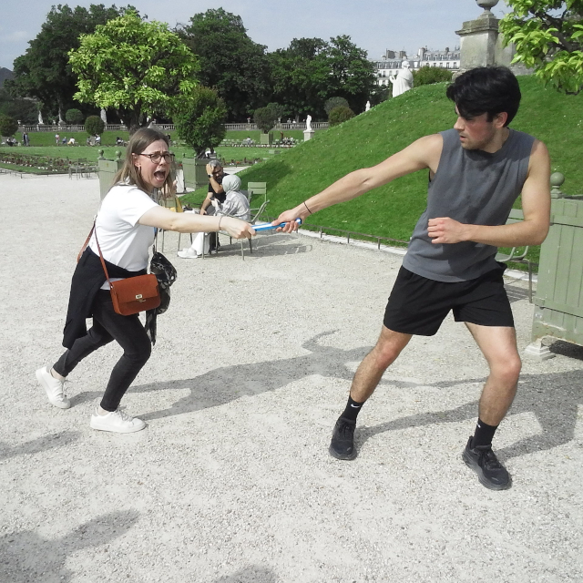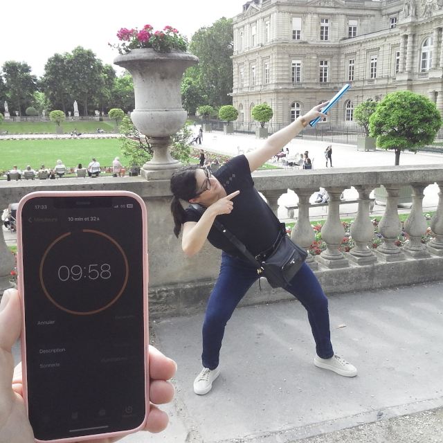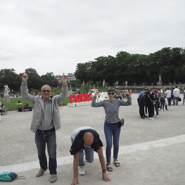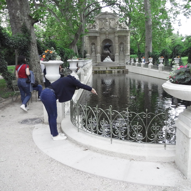 links Charlie beim Startsprung ins Medicis-Becken - rechts Aurélie vorm Panthéon