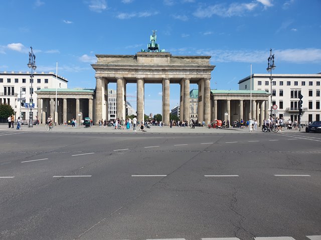 das Brandenburger Tor mit Mauer-Markierung (zwischen den weißen Fahrbahnmarkierungen im Vordergrund)