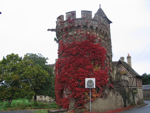 une tour avec gargouille et la mairie d'Aunay-sur-Odon